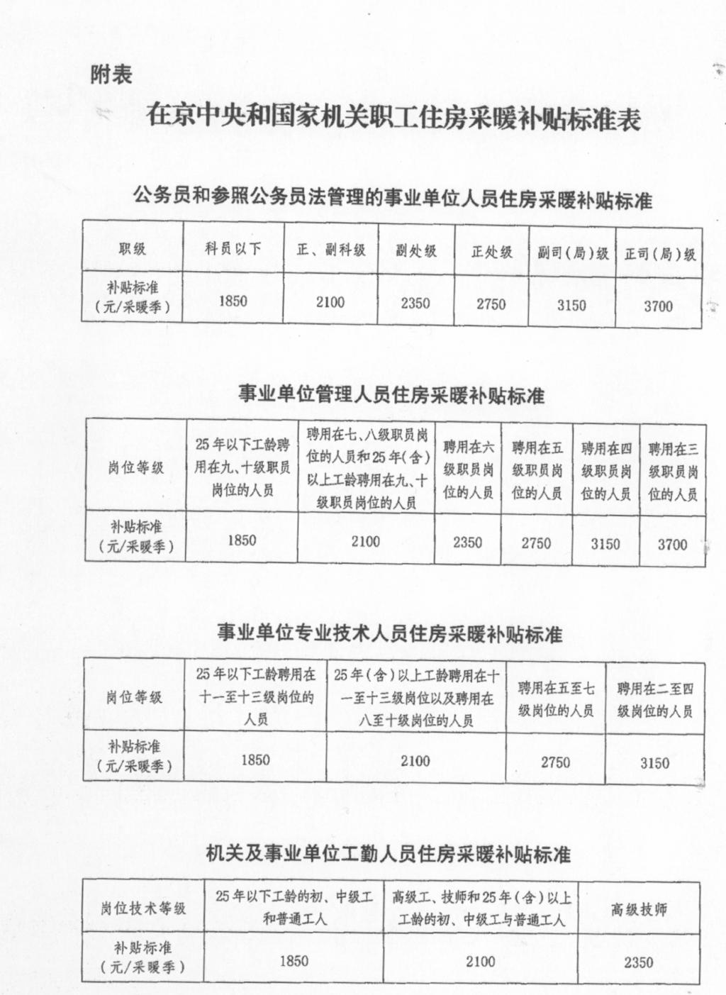 第四条 补贴标准。根据在京中央和国家机关职工住房控制面积标准和北京市采暖价格等因素确定并调整。具体标准见附表。